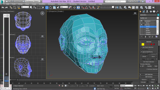 使用3D Max製作臉部建模的成果。其使用Bump讓臉部的紋路更逼真,而額頭上的布更是用Bump凸顯凹凸感,讓模型的面不高,卻能做出紋理相當精緻的模型。